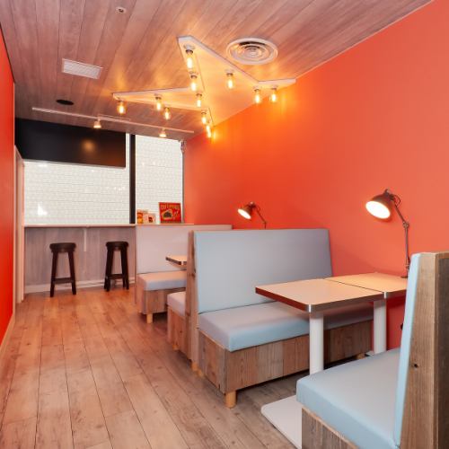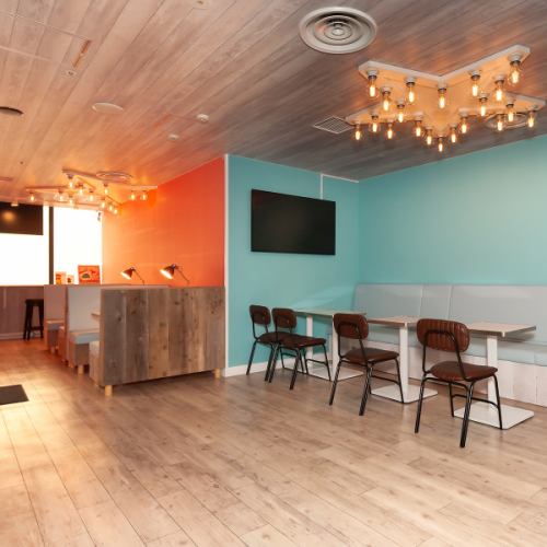 当店の内装は、サーモンピンクとターコイズブルーのコントラストが特徴的な、SNS映えするデザインです◎お席の場所によって色が異なり、どの席に座っても華やかな雰囲気を楽しめます。ハンバーガーの写真を撮るときは、特に映えます♪お席は、カウンター席、テーブル席、ソファ席をご用意!様々なシーンでご利用可能です。